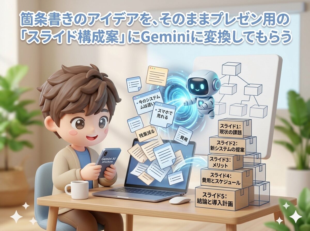 Geminiを使えば、箇条書きが瞬時に「骨組み」に変わる